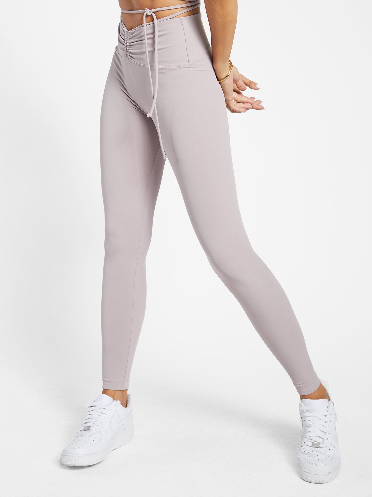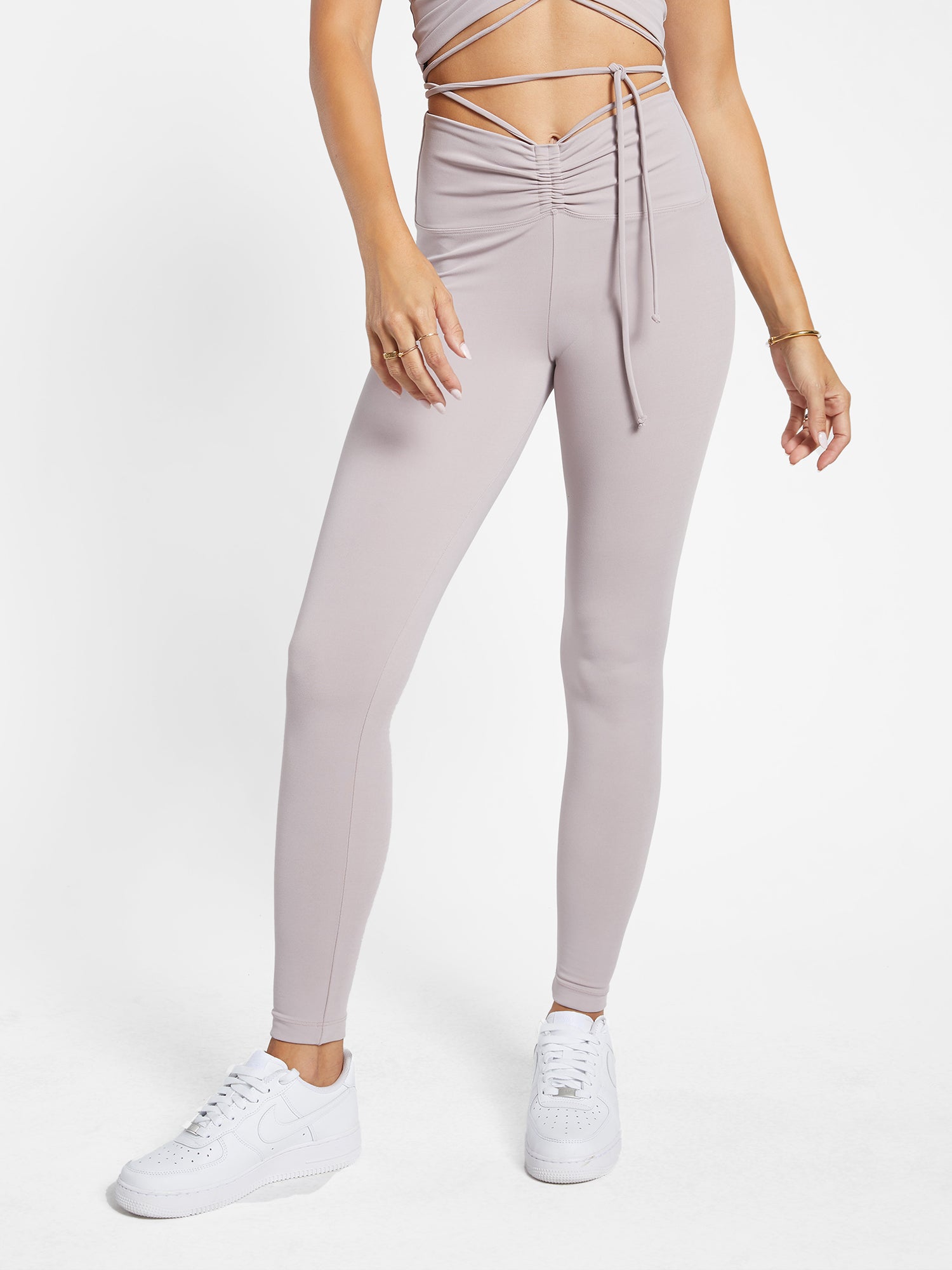 High rise legging with a ruched front with a unique, craw-string waist that can be tied in a myriad of flattering ways. These high-performance bottoms are cut with our sustainable Blackout™ fabric, offering a gentle compression combined with anti-pilling properties for long lasting wear.
